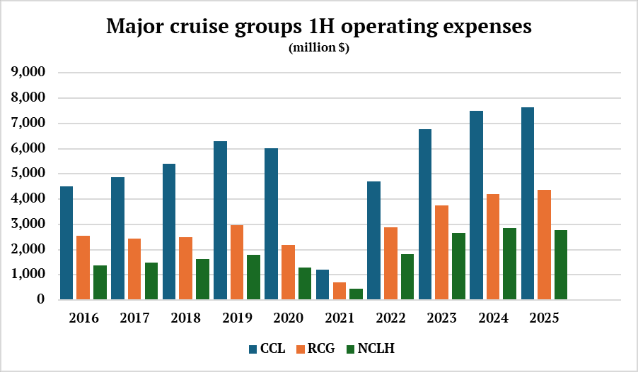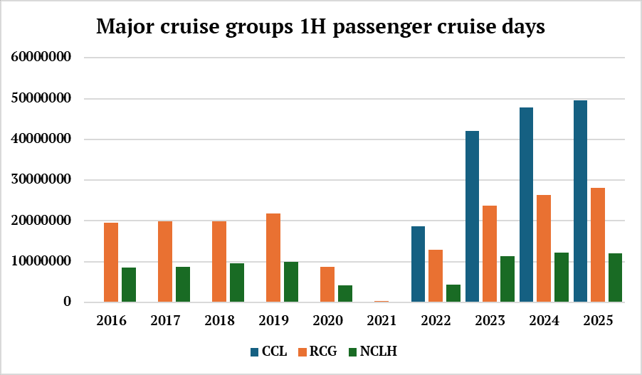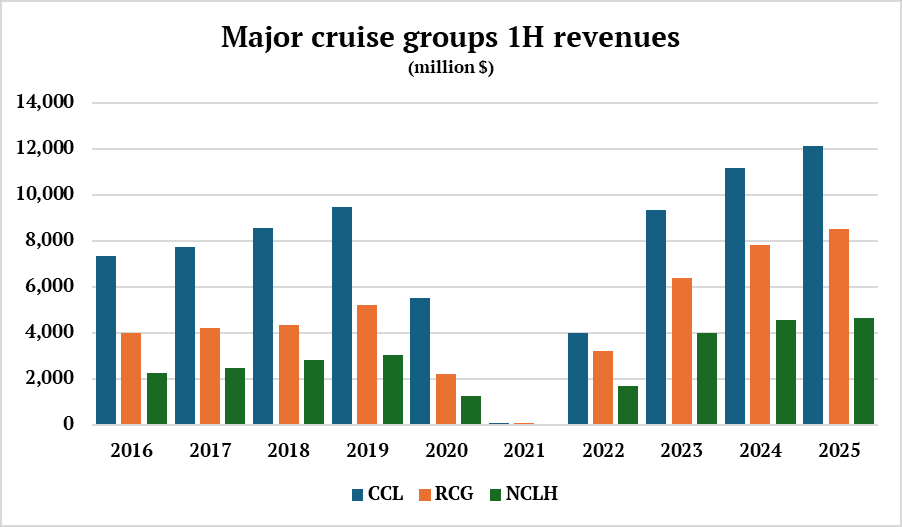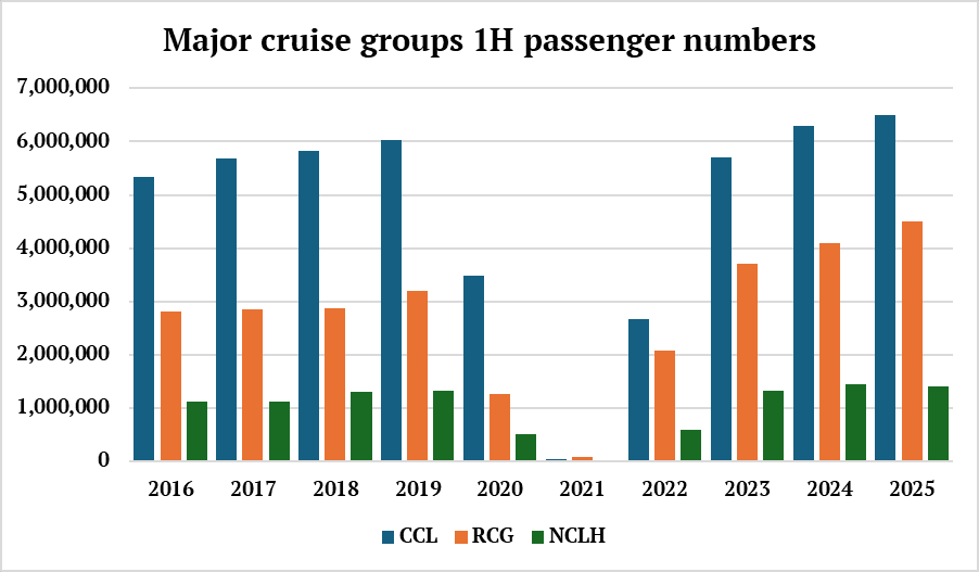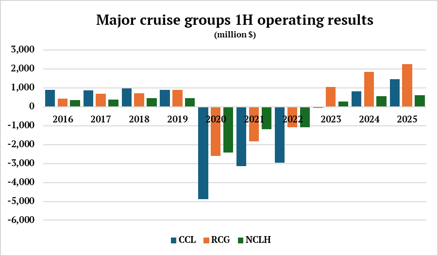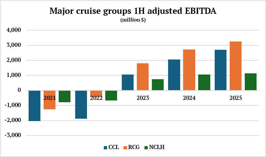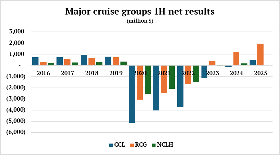 In terms of six-month net results, RCG was again the star performer, with a figure of $1.95 billion, a 60% improvement on the already extraordinary performance of the same period in 2024, outperforming its nearest rival by a huge margin. CCL’s six-month net result turned positive for the first time since 2019, while NCLH headed in the opposite direction: it reported a $10.3 million net loss in the first half of 2025, after its net result turned positive in the first half of 2024. In this regard, figures for CCL and NCLH are a somewhat concerning sign for the sector.