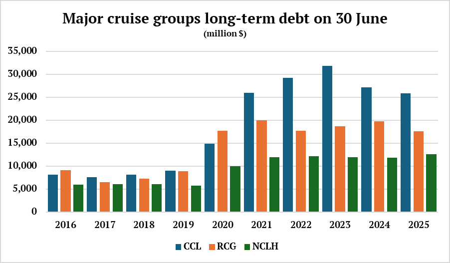Operating under such an oppressive debt regime makes these cruise groups vulnerable to interest rates rising or credit markets tightening. And with their expanding newbuilding programmes, long-term debts may be a heavy pressure for years to come.