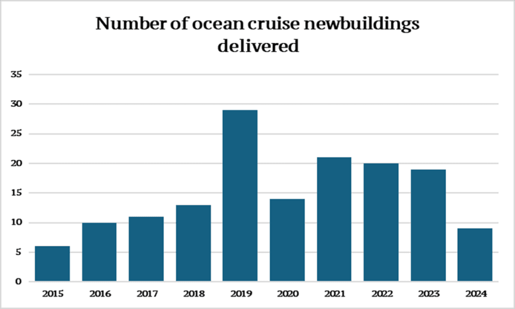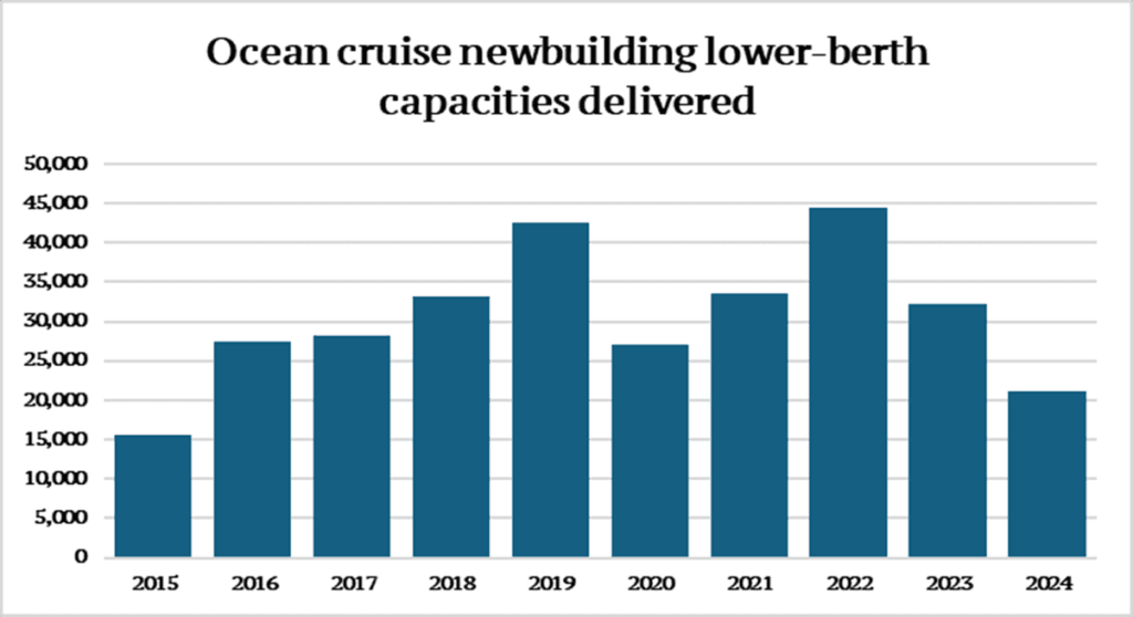 2024 was not a banner year for ocean cruise newbuildings. Only nine units of various sizes, totalling 21,212 lower berths, were handed over to their owners. The overall vessel capacity delivered in the 12-month period was 34% lower than in 2023.